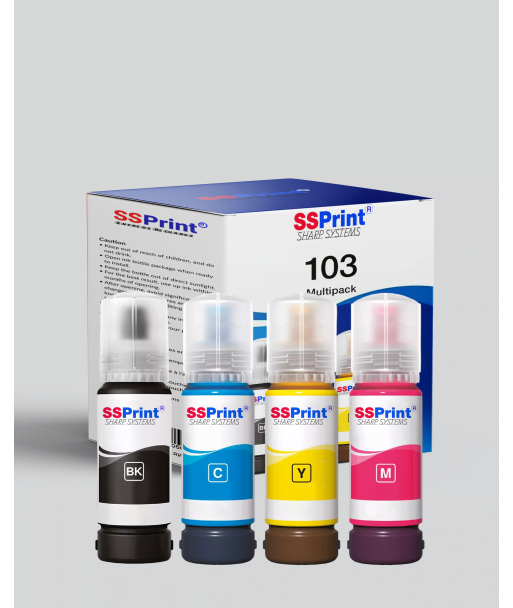 Pack de 4 encres compatibles Epson 103 (Noir, Cyan, Magenta, Jaune) pour imprimantes Epson EcoTank. Solution économique et qualité d'impression professionnelle.